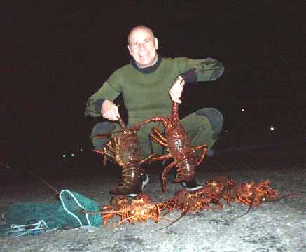 Still talking about the old guy, and how he was right on the first two counts but definitely dead wrong on the third! But wait! It dawned on me that we were passing over a really interesting bottom - you could make out swiss cheese-like formations in the coquina rock bottom, and fish - lots of 'em - moving in and out of the holes. I threw on a mask and dove in. To my amazement, found hole after hole full of lobster - big juicy wonderful lobster! I grabbed one, then two. Shoving them under my arm, I went for three. Then I realized --oops-- I'm holding my breath! I signaled to my daughter to get me a bag quick, because I didn't want to lose my place, shoving number four under the other arm. I went back for my tank, and started a mass exodus into the water. We all got our limit. Steering a course home with a beautiful sunset upon us, I have to say it was one of the most memorable lobster trips I can remember. And I'm sure I wasn't the only one thinking, Old Man, whoever you are, wherever you are, thanks!